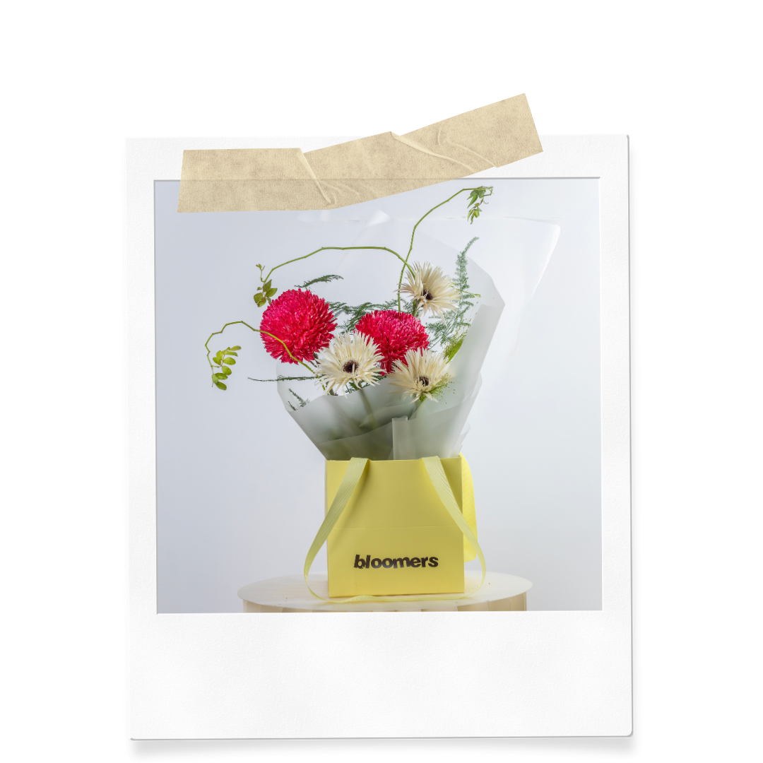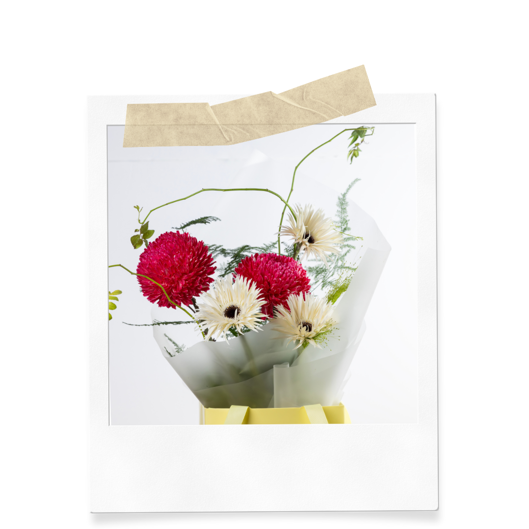a lively mix of red peonies, bright gerberas, and rosa smeralda blooms, tied together with soft green foliage. arranged freshly and wrapped in our signature packaging.